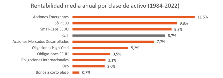 Además del sólido desempeño histórico que se acerca mucho al marco accionarial estadounidense, existen diferentes segmentos de REIT que, a lo largo de los años, han ofrecido rentabilidades superiores a las del S&P 500, como los REIT en los segmentos de almacenes, industrial y residencial.
