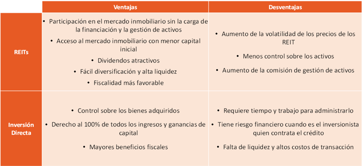 A continuación, se muestra una tabla que contiene las principales ventajas y desventajas de invertir en REIT en comparación con invertir directamente en bienes raíces.