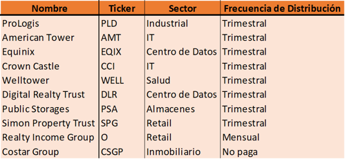 A continuación, se muestra una tabla con la lista de los diez REIT más grandes entre los que los inversores pueden elegir para estar expuestos a los diversos segmentos de bienes raíces.